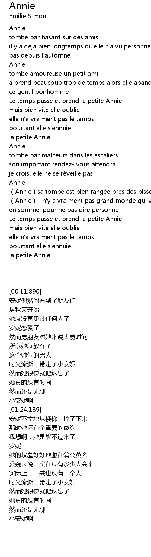 | [00:45.589] | Le temps passe et prend la petite Annie |