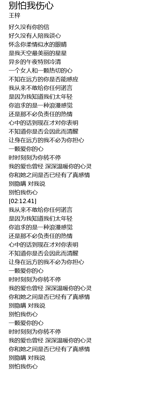 | [03:34.81] | bié pà wǒ shāng xīn |