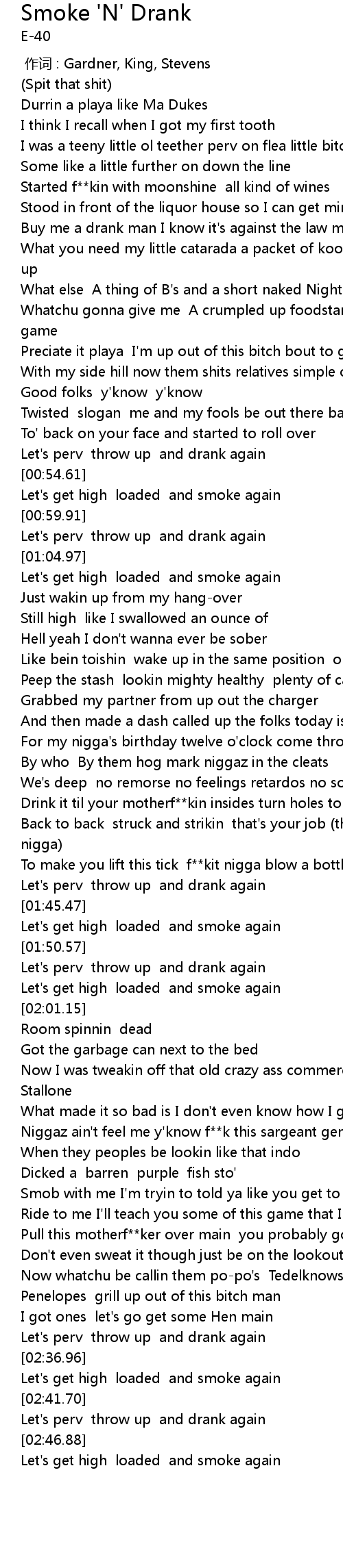| [01:33.48] | Drink it til your motherf**kin insides turn holes to cross and wallow |