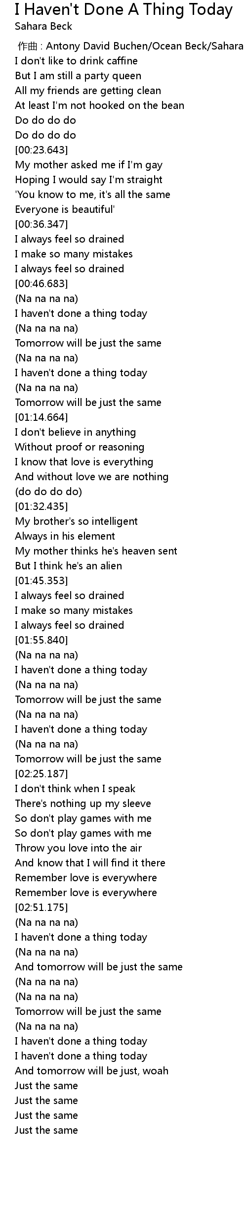 | [00:52.668] | I haven' t done a thing today |