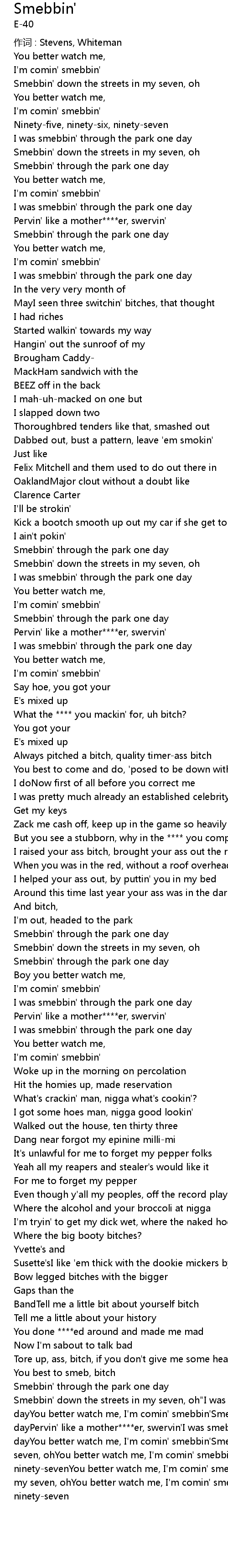 | Smebbin' down the streets in my seven, oh"I was smebbin' through the park one dayYou better watch me, I'm comin' smebbin'Smebbin' through the park one dayPervin' like a mother****er, swervin'I was smebbin' through the park one dayYou better watch me, I'm comin' smebbin'Smebbin' down the streets in my seven, ohYou better watch me, I'm comin' smebbin'Ninety-five, ninety-six, ninety-sevenYou better watch me, I'm comin' smebbin'Smebbin' down the streets in my seven, ohYou better watch me, I'm comin' smebbin'Ninety-five, ninety-six, ninety-seven |
