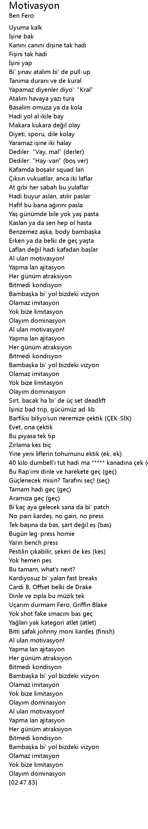 | [01:40.97] | 40 kilo dumbell'ı tut hadi ma ***** kanadına çek (çek) |