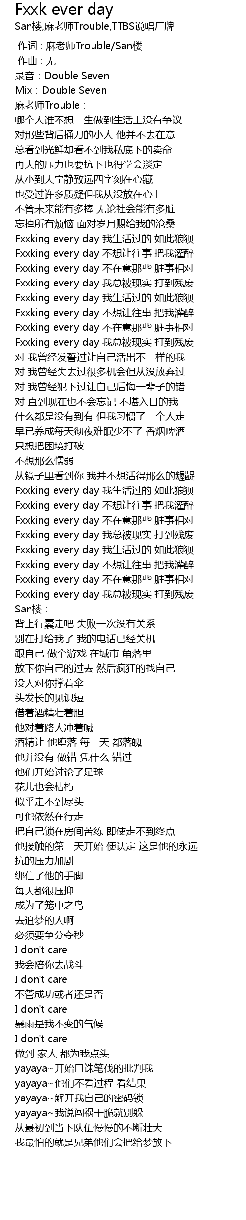 | [01:56.502] | Fxxking every day wǒ shēng huó guò de rú cǐ láng bèi |