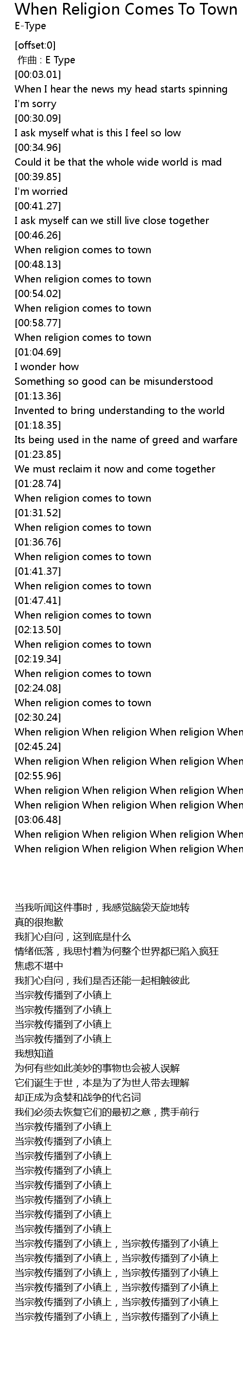 | [03:02.74] | When religion When religion When religion When religion comes to town |
