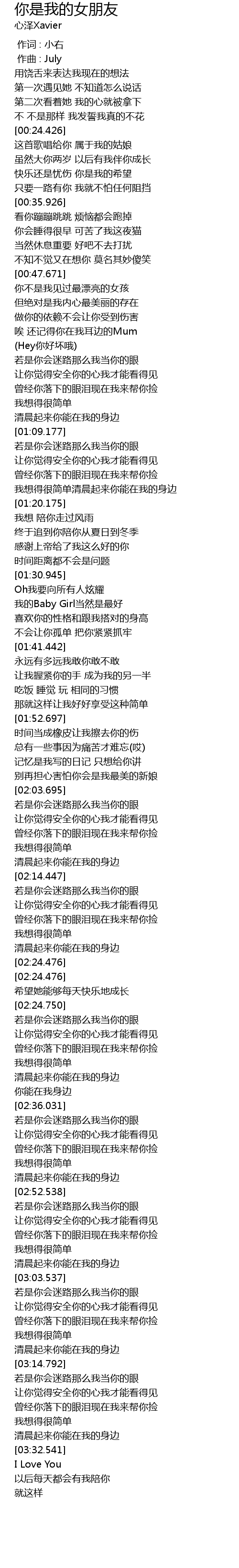 | [02:24.750] | 希望她能够每天快乐地成长 |