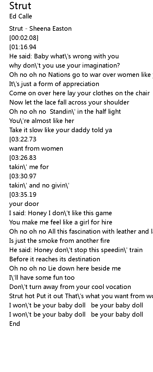 | [03:48.85][03:30.97][03:13.19][02:07.67][01:07.50] | Strut hot Cut it out No takin\' and no givin\' |
