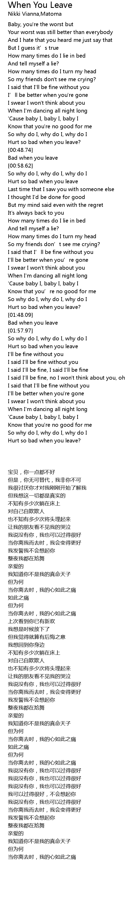 | [00:46.17] | Hurt so bad when you leave? |