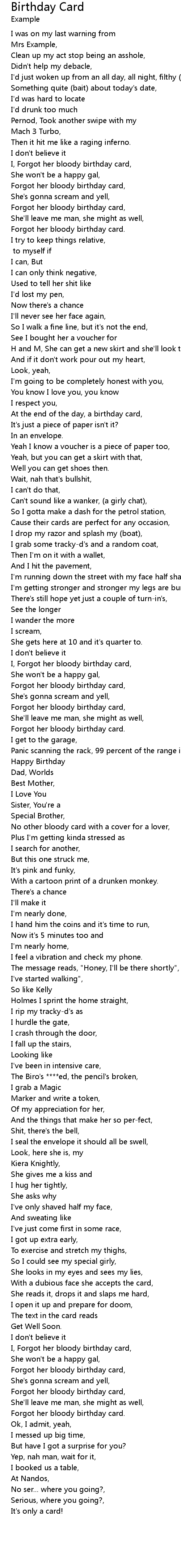 I, Forgot her bloody birthday card, |