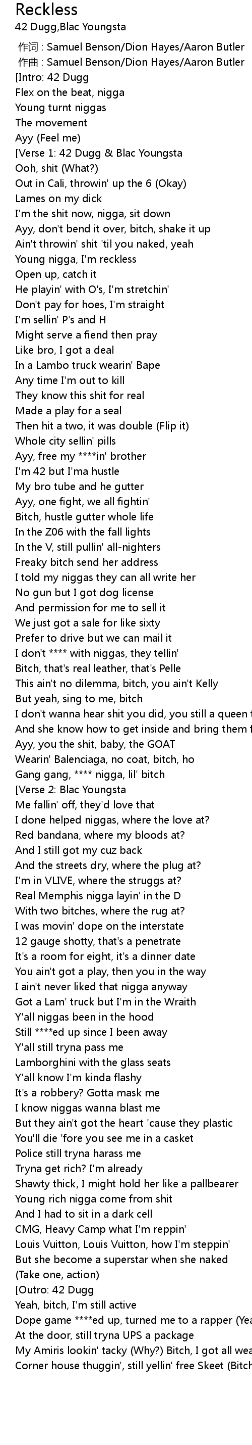 | [00:25.21] | Young nigga, I' m reckless |