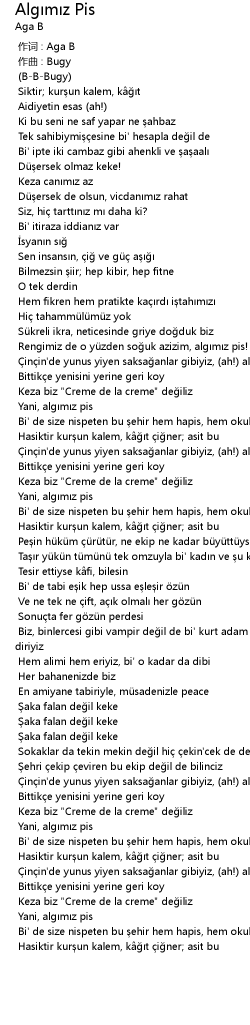 | [01:29.718] | Çinçin'de yunus yiyen saksağanlar gibiyiz, (ah!) algımız pis |