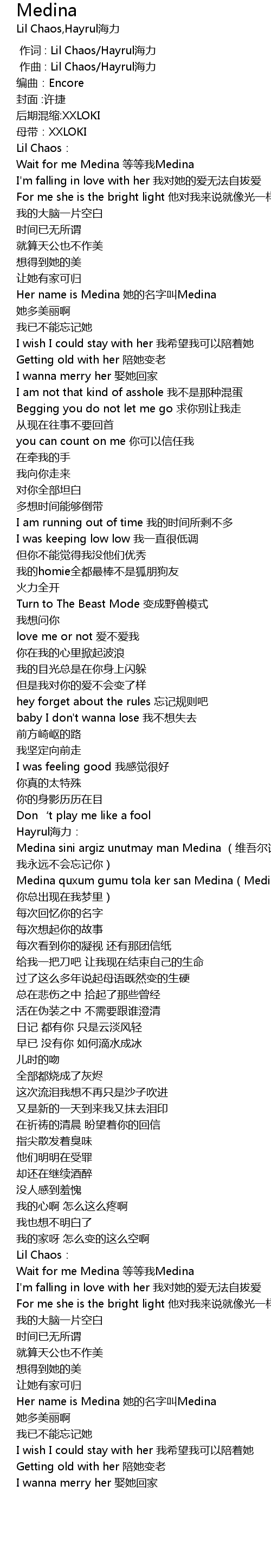 | [03:33.667] | Her name is Medina tā de míng zì jiào Medina |