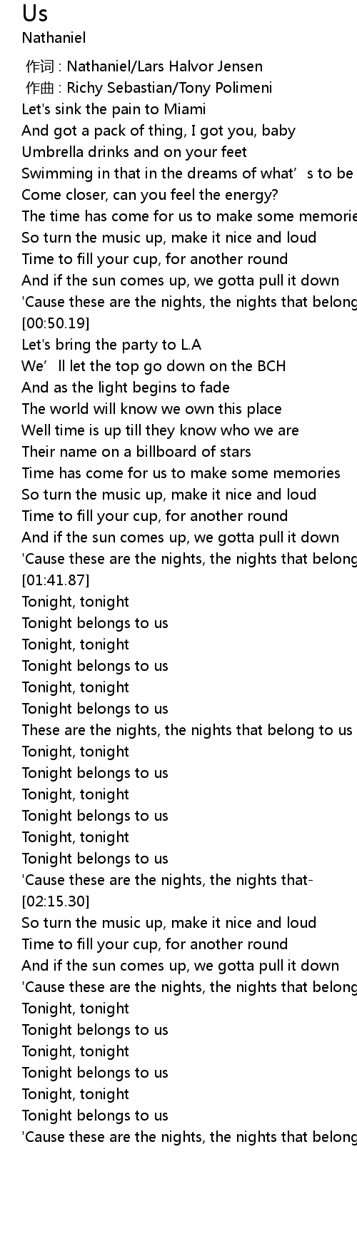 | [00:45.28] | 'Cause these are the nights, the nights that belong to us |