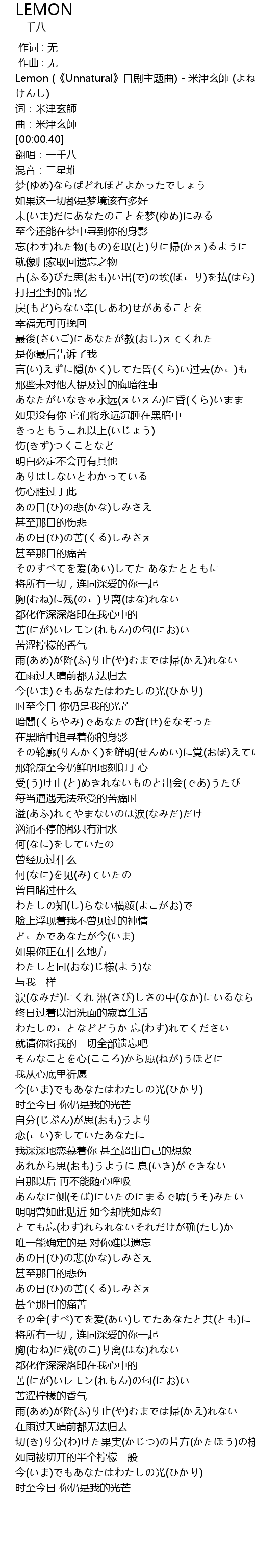 | [00:00.10] | Lemon (《Unnatural》日剧主题曲) - 米津玄師 (よねづ けんし) |