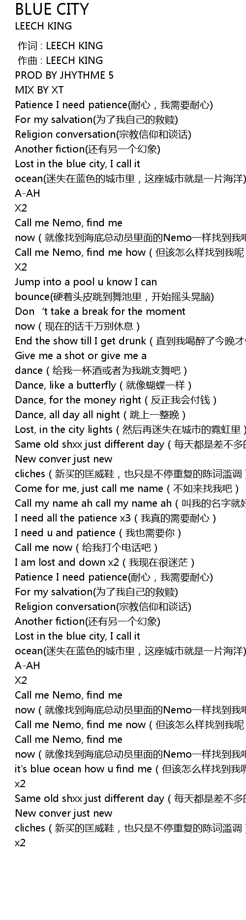 | [00:01.000] | zuò qǔ : LEECH KING |