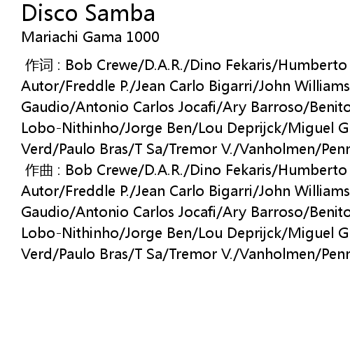 | [00:00.000] | 作词 : Bob Crewe/D.A.R./Dino Fekaris/Humberto Tozzi/Sin Autor/Freddle P./Jean Carlo Bigarri/John Williams/Patrick Hernandez/Robert Gaudio/Antonio Carlos Jocafi/Ary Barroso/Benito Di Paula/Edu Lobo/Haroldo Lobo-Nithinho/Jorge Ben/Lou Deprijck/Miguel Gustaud/Rodolpho De souza/Alho Verd/Paulo Bras/T Sa/Tremor V./Vanholmen/Penny Els/Wando |