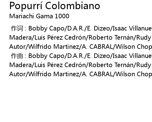 | [00:00.000] | 作曲 : Bobby Capo/D.A.R./E. Dizeo/Isaac Villanueva/Juan Madera/Luis Pérez Cedrón/Roberto Ternán/Rudy La Scala/Sidney Simien/Sin Autor/Wilfrido Martinez/A. CABRAL/Wilson Choperena/Calixto Ochoa |