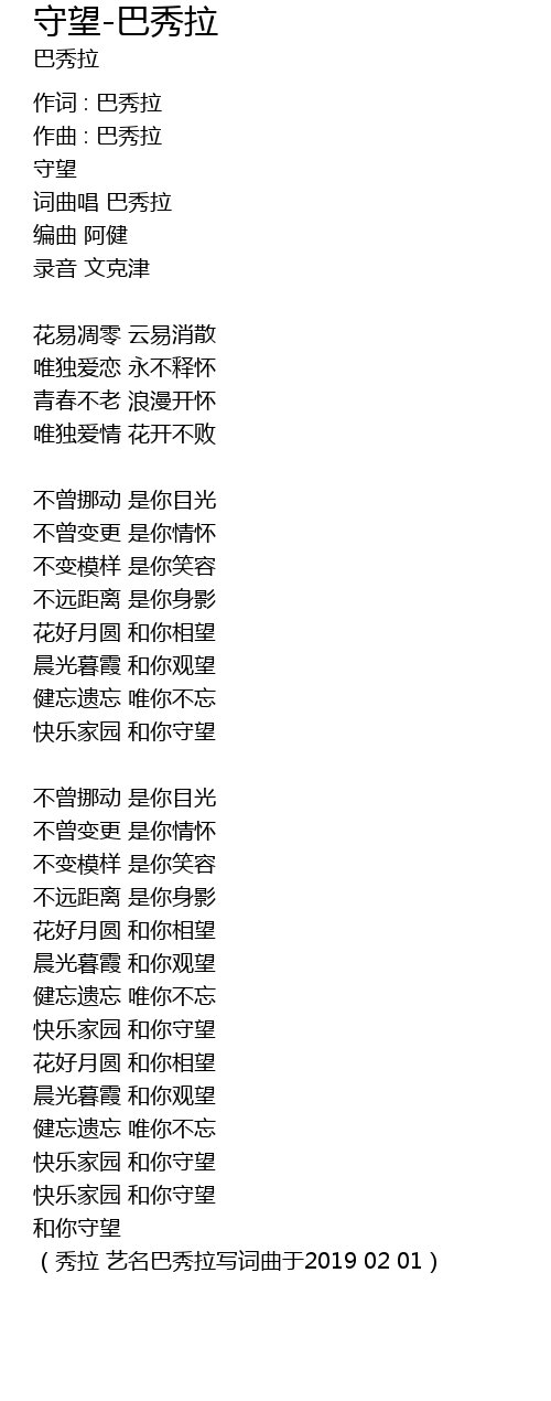 | (秀拉 艺名巴秀拉写词曲于2019 02 01) |