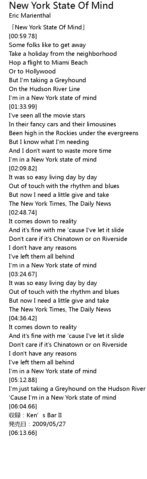 | [05:38.69] | ' Cause I' m in a New York state of mind |