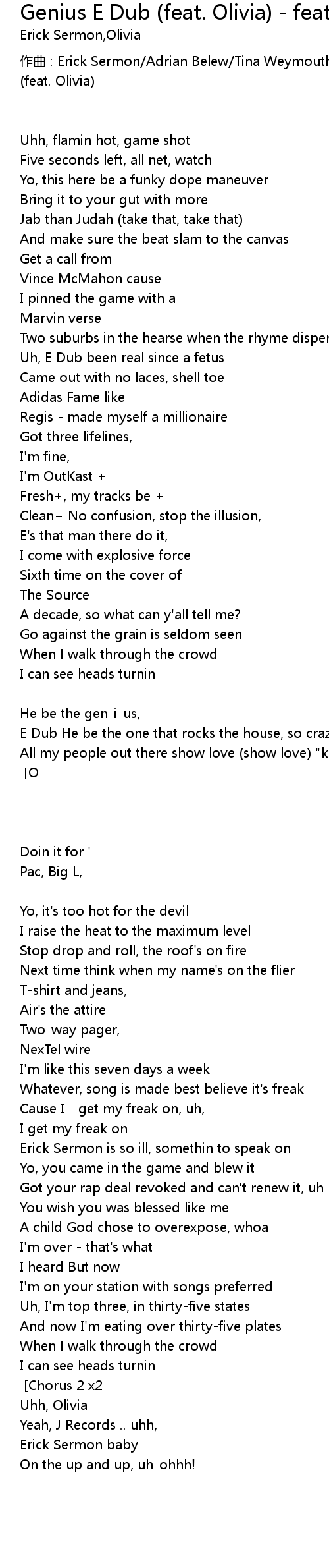 | I hear voices sayin, "That's Erick Sermon" [Chorus 1] [Chorus 2 x2] [Olivia] | |