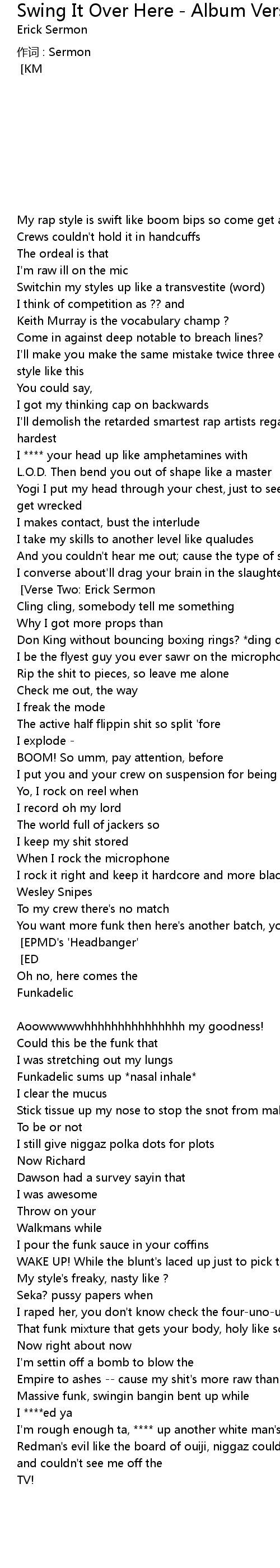 | I converse about' ll drag your brain in the slaughterhouse Chorus: change to all throughout Verse Two: Erick Sermon | |