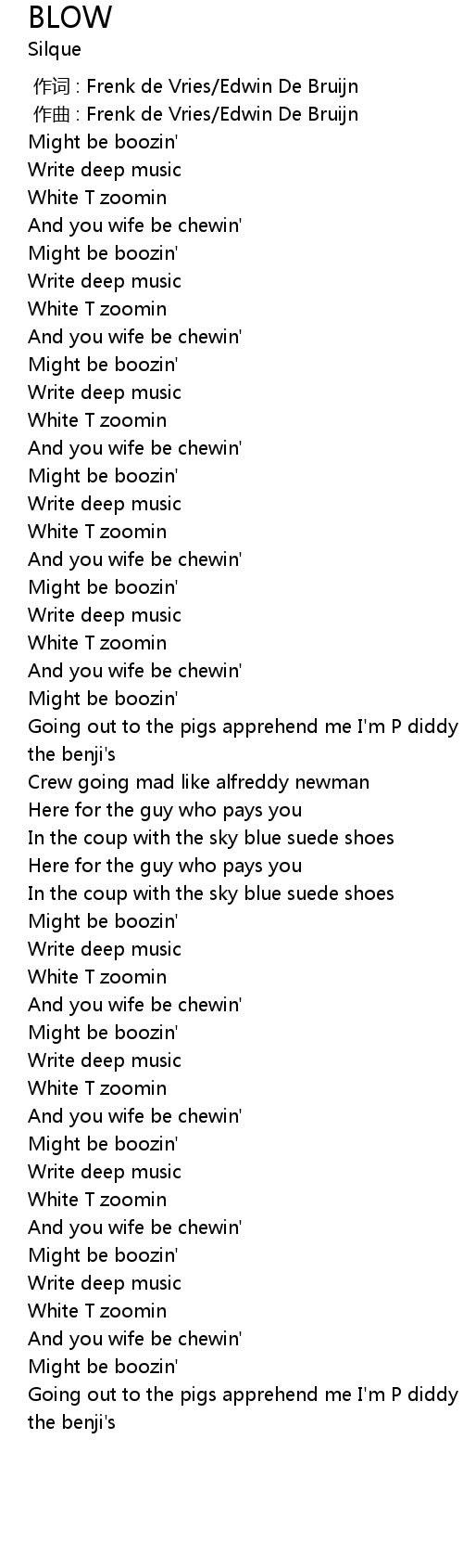 | [01:45.444] | In the coup with the sky blue suede shoes |