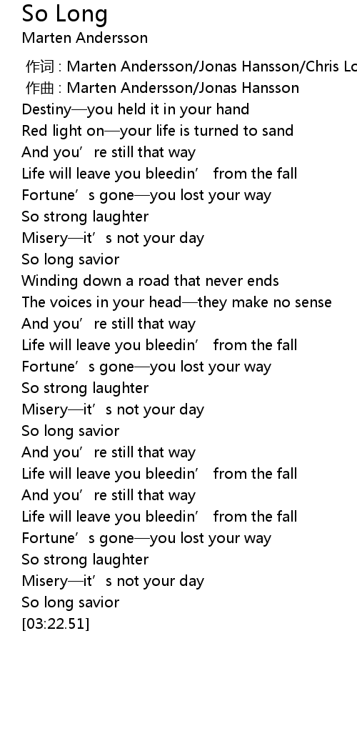 | [00:00.000] | 作词 : Marten Andersson/Jonas Hansson/Chris Logan |