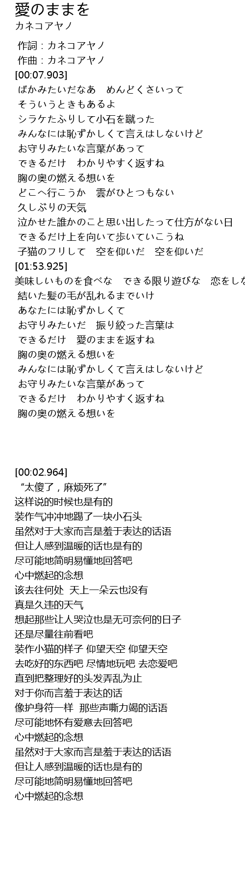 | [02:28.022] | できるだけ 愛のままを返すね |