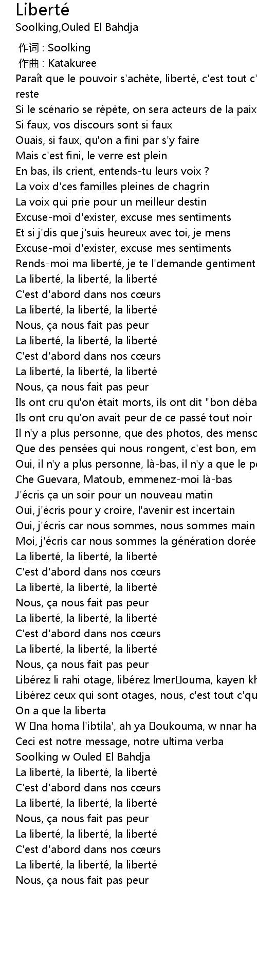 | [00:21.16] | Para t que le pouvoir s' ache te, liberte, c' est tout c' qui nous reste |