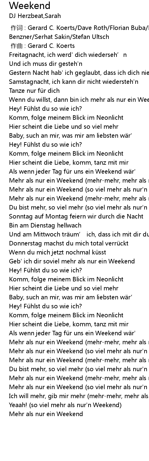 | [01:02.35] | Mehr als nur ein Weekend (mehr-mehr, mehr als nur'n Weekend) |