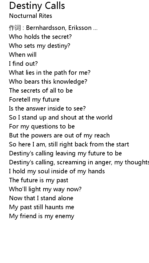 | Destiny' s calling, screaming in anger, my thoughts are out of reach | |