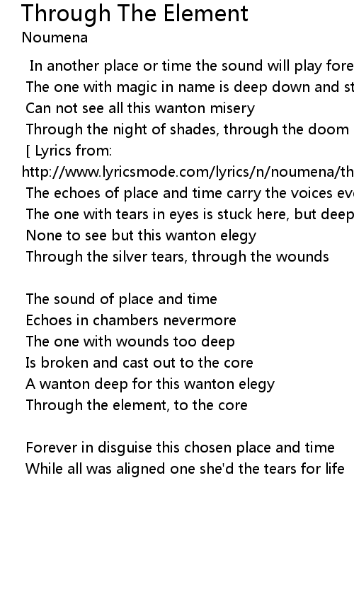 [ Lyrics from: http://www.lyricsmode.com/lyrics/n/noumena/through_the_element.html ] |