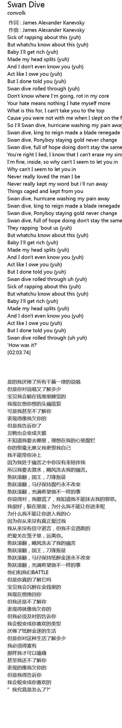 | [01:31.06] | Swan dive, full of hope doing don't stay the same |