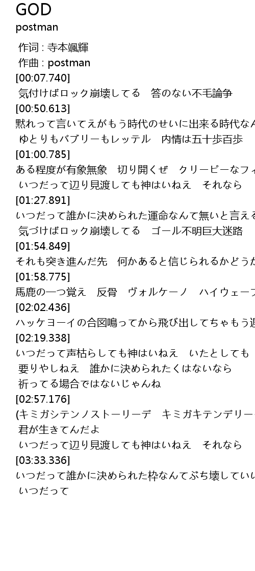 | [02:19.338] | いつだって声枯らしても神はいねえ いたとしても |
