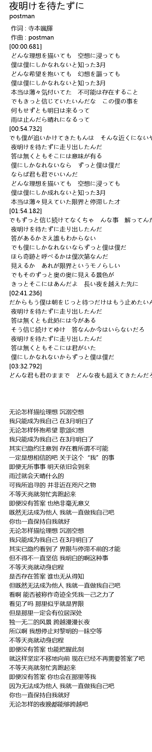 | [02:52.846] | 夜明けを待たずに走り出したんだ |