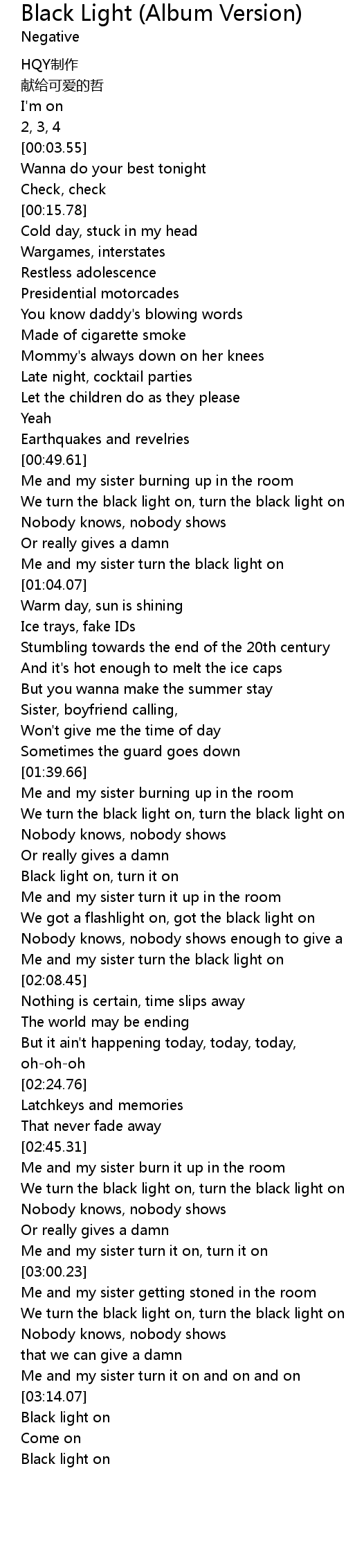 | [00:53.26] | We turn the black light on, turn the black light on |