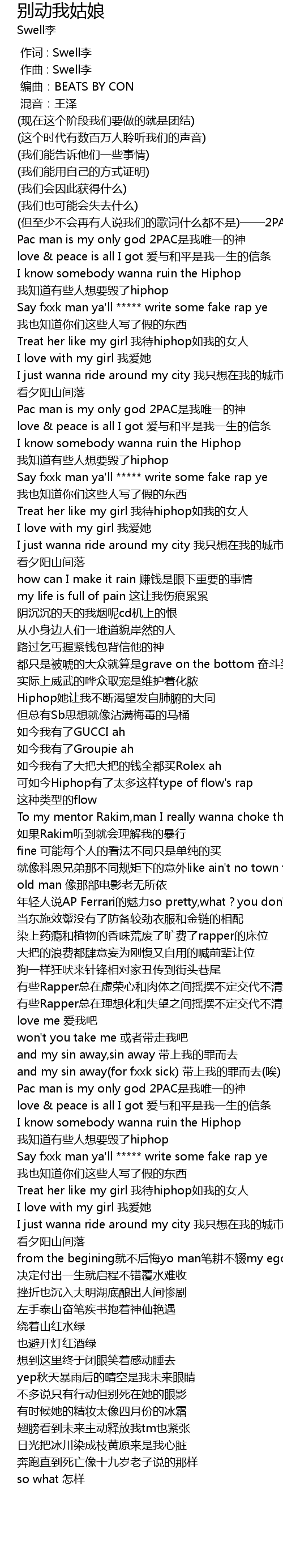 | [02:28:00] | Say fxxk man ya' ll write some fake rap ye wǒ yě zhī dào nǐ men zhèi xiē rén xiě le jiǎ de dōng xī |