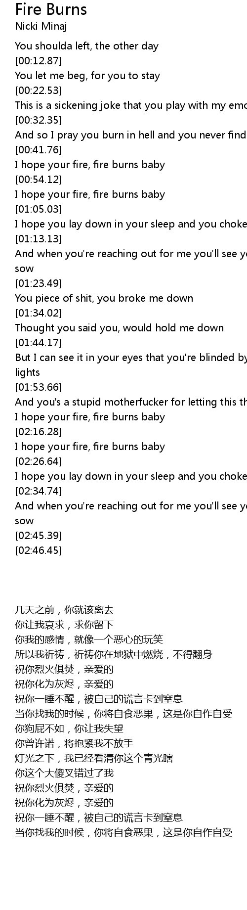 [02:18.50] I hope your fire, fire burns baby