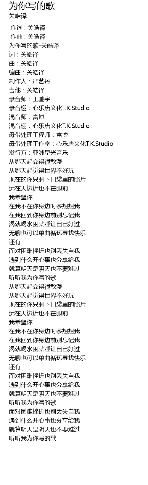 | [00:00.424] | 为你写的歌-关皓译 |