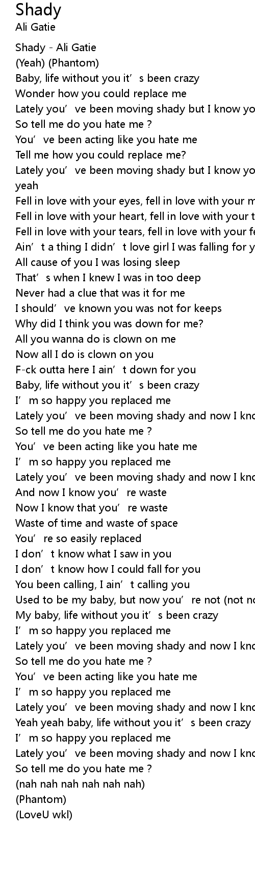 | [01:25.70] | Lately you’ve been moving shady and now I know you're shady |