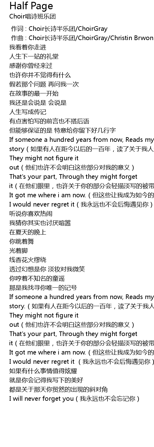 | [02:55.718] | If someone a hundred years from now, Reads my whole life story. rú guǒ yǒu rén zài jù jīn yǐ hòu de yī bǎi nián, dú le guān yú wǒ rén shēng de suǒ yǒu gù shì |