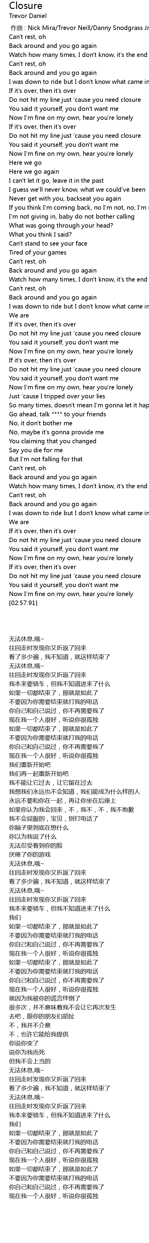 | [00:41.14] | Do not hit my line just 'cause you need closure |