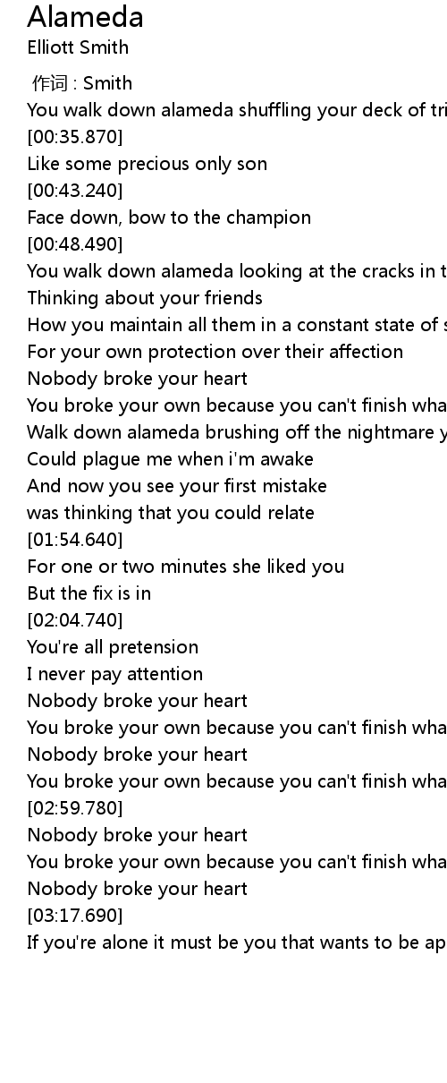 | [00:50.420] | You walk down alameda looking at the cracks in the sidewalk |