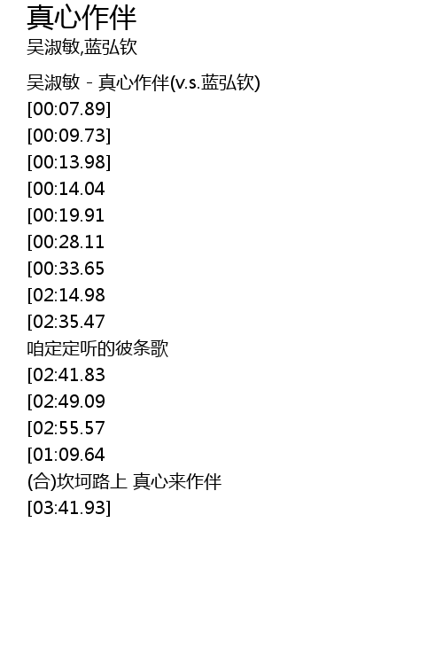 | [00:01.12] | 吴淑敏 - 真心作伴(v.s.蓝弘钦) |