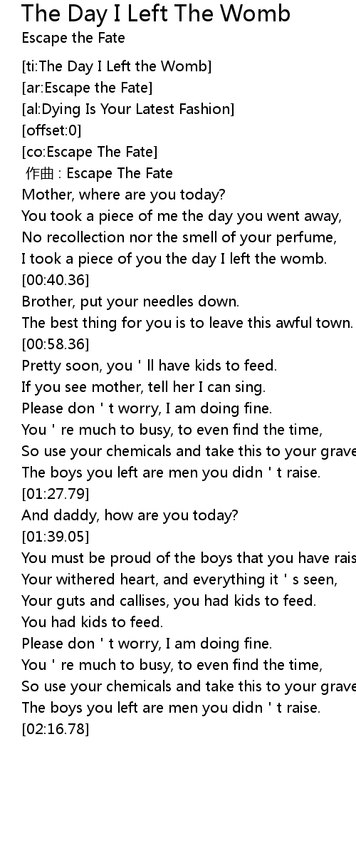 | [00:00.00] | zuò qǔ : Escape The Fate |