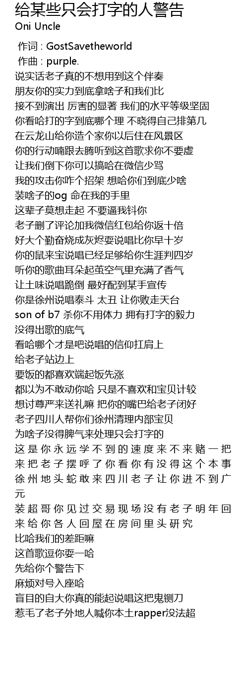 | [01:32.933] | rě máo le lǎo zi wài dì rén hǎn nǐ běn tǔ rapper méi fǎ chāo |