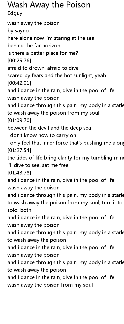 | [02:04.94] | to wash away the poison from my soul, turn it to gold |