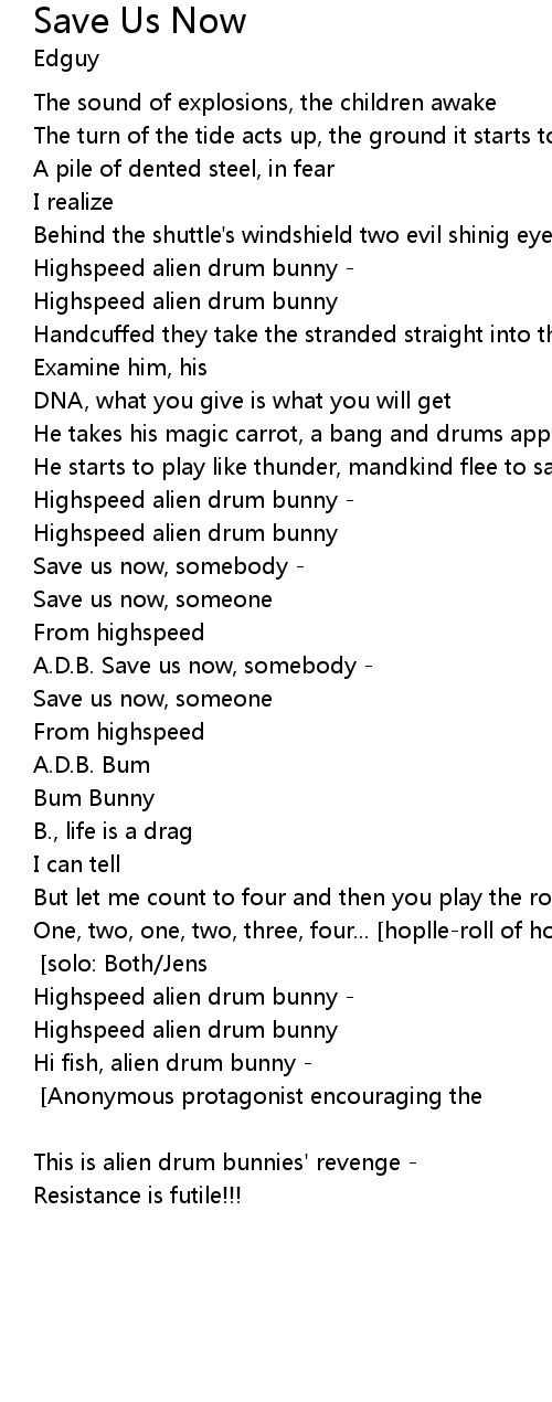 | Hasi, alien drum bunny [repeat chorus] [Anonymous protagonist encouraging the cheering masses:] | |