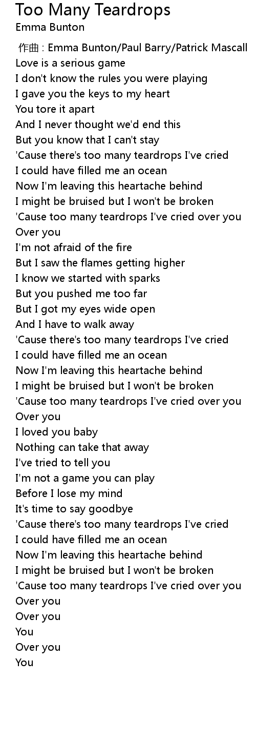 | [01:38.45] | 'Cause too many teardrops I've cried over you |