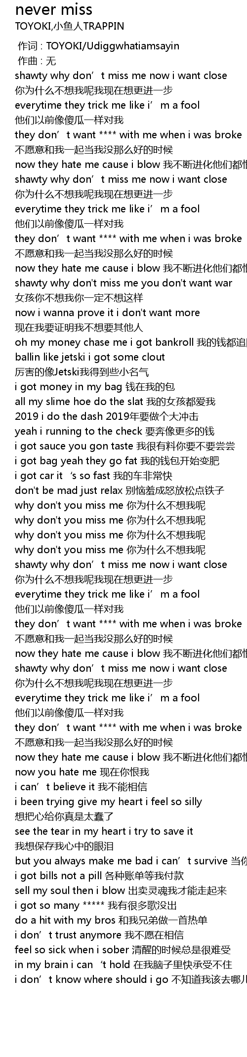 | [01:33.433] | shawty why don' t miss me now i want close nǐ wèi shí me bù xiǎng wǒ ne wǒ xiàn zài xiǎng gèng jìn yī bù |