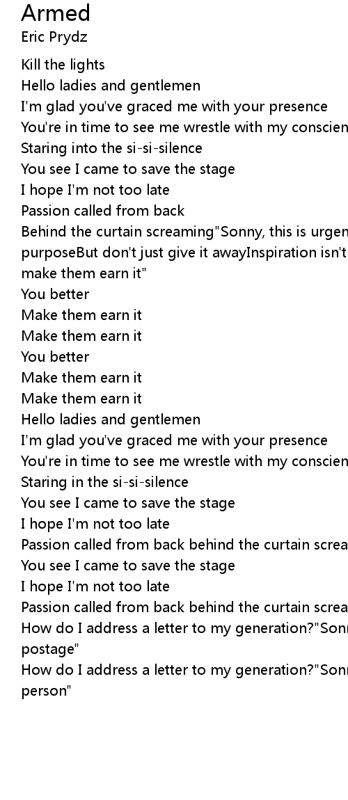 Behind the curtain screaming"Sonny, this is urgentFill these 50 voices with a purposeBut don't just give it awayInspiration isn't cheap these daysYou better make them earn it" |